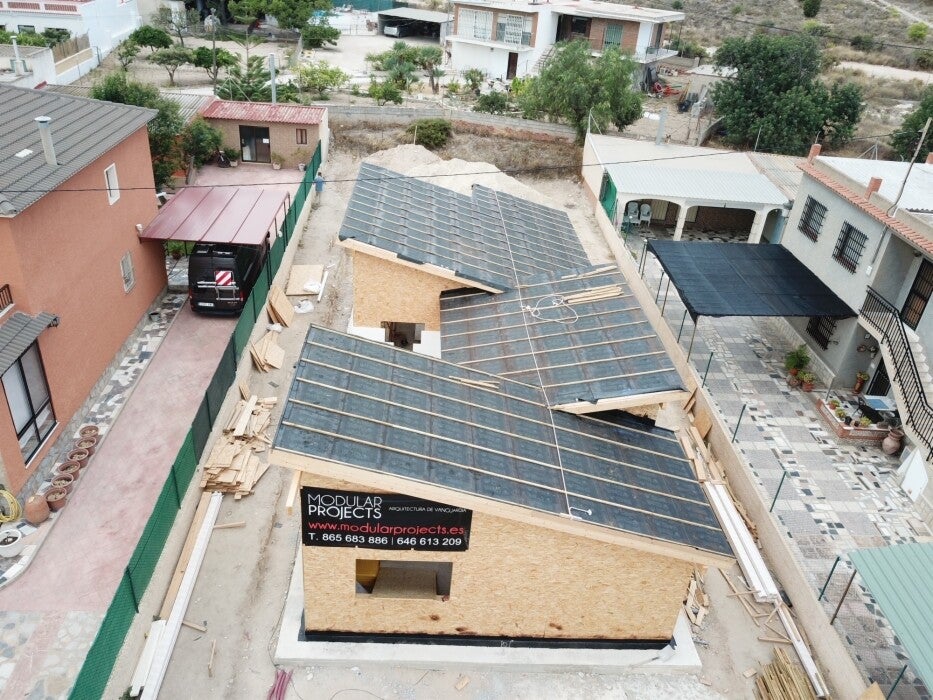Vivienda con cubierta a dos aguas formando un juego espacial muy interesante. Esta vivienda tiene 120m2 en una sola planta con 3 dormitorios dobles y dos baños. Su precio es de 156.000€ + IVA. Actualmente en construcción.