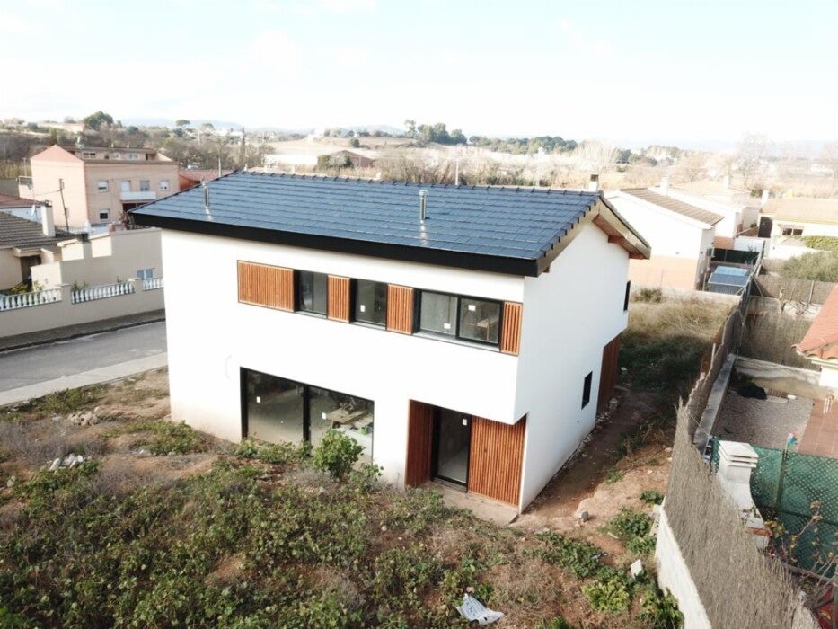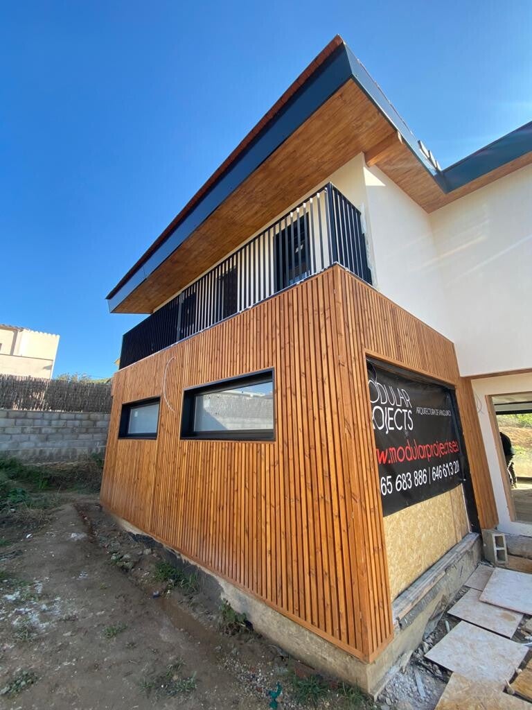 Vivienda de 140m2 en dos plantas con cubierta inclinada. Acabada exterior en Sate Blanco y Celosia de madera de abeto. Esta preciosa vivienda tiene 3 dormitorios dobles y un salón a doble altura fantaático. Su precio es de 182.000€ mas IVA llave en mano.