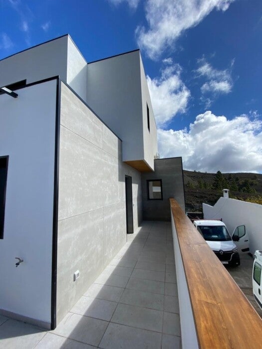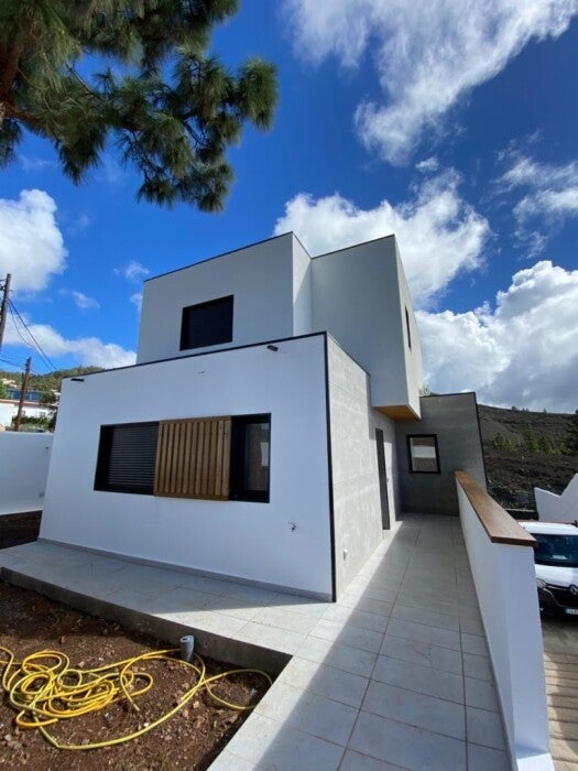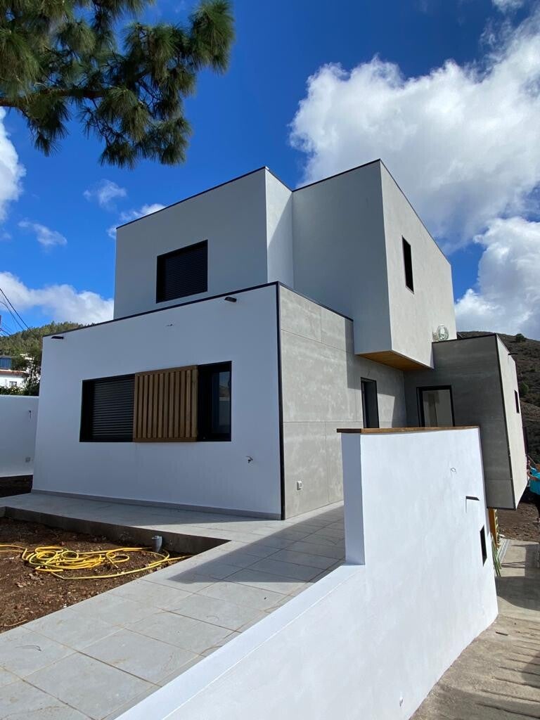 Vivienda de 140 m2 en tres plantas. Hemos aprovechado el desnivel de la parcela para diseñar esta vivienda con un pequeño garaje en planta baja, cocina comedor salón en planta primera y 3 dormitorios en planta segunda. Estéticamente hemos realizado unos cubos superpuestos blancos acabados en Sate Blanco y Viroc con nuestros toques de celosía de Abeto. Su precio es de 182.000€ mas IVA llave en mano.