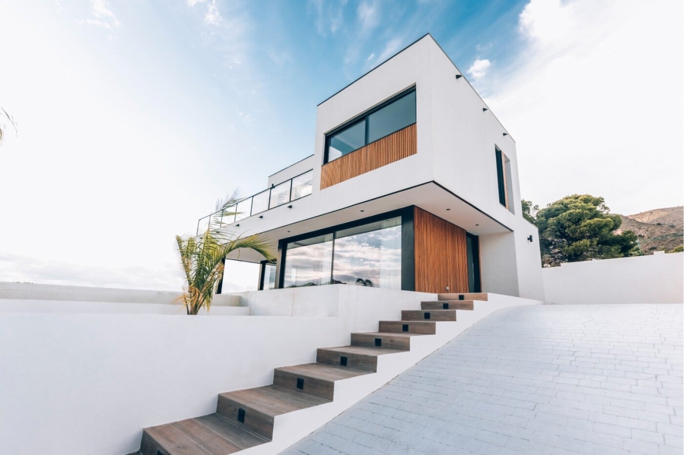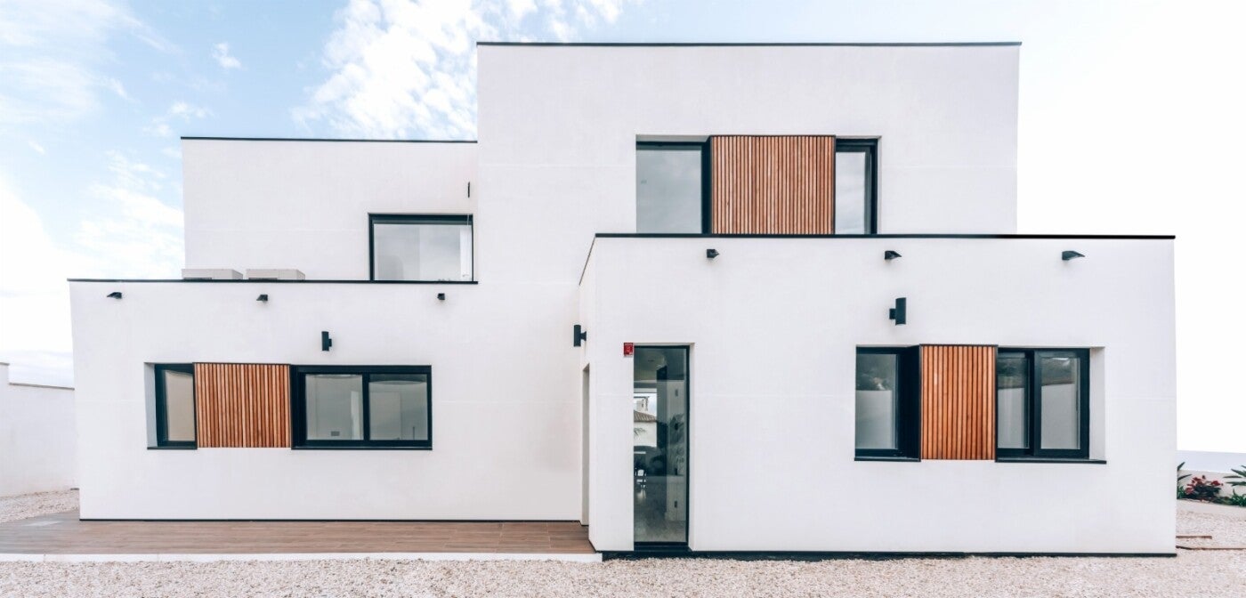 Vivienda de 220 m2 en dos plantas con un diseño exterior moderno que combina el Sate blanco con detalles de madera muy tipicos nuestros. Esta vivienda tiene cuatro dormitorios dobles y cuatros baños completos y su precio es de 261.800€ mas IVA llave en mano.