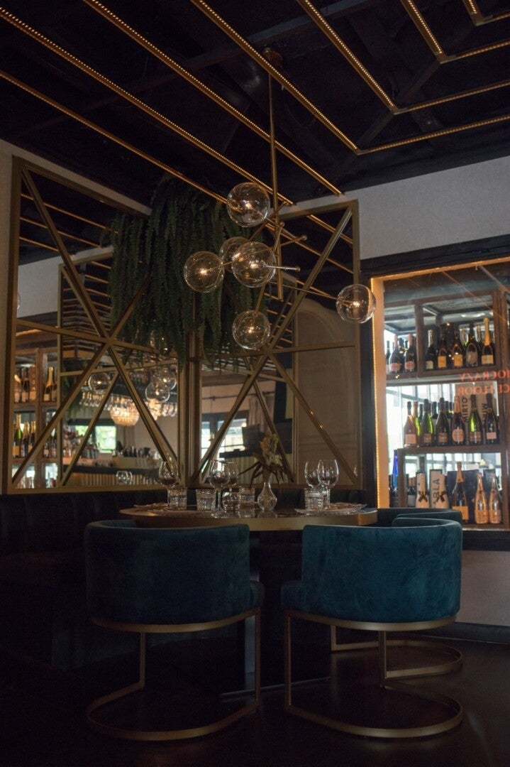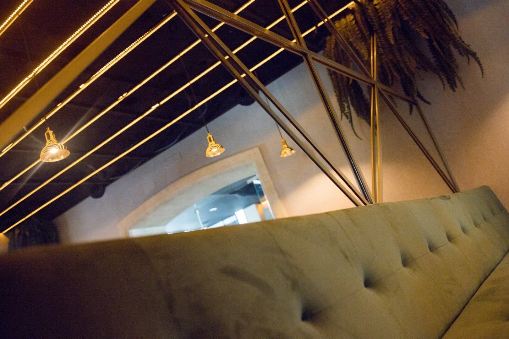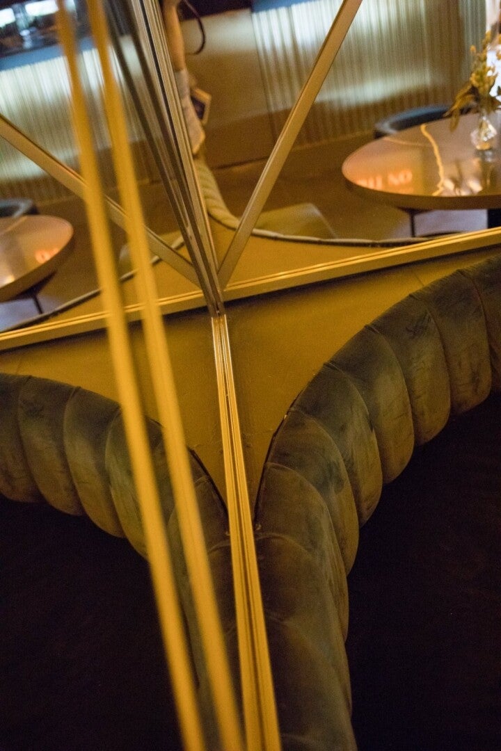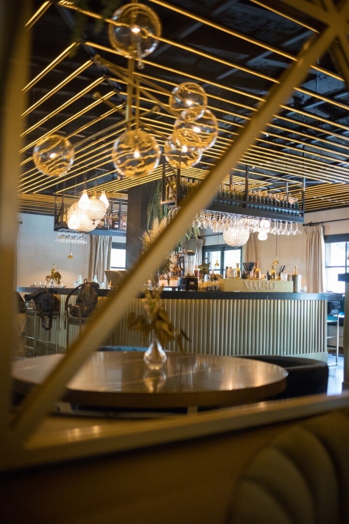 Todos los elementos se han hecho a medida, desde las mesas hasta las barras. Jugando con chapa, terciopelo, espejos, iluminación y el broche final: EL TECHO. Un juego de iluminación único diseñado en exclusiva para Mauro y que está inspirado y rinde homenaje al famoso local neoyorkino Studio 54.